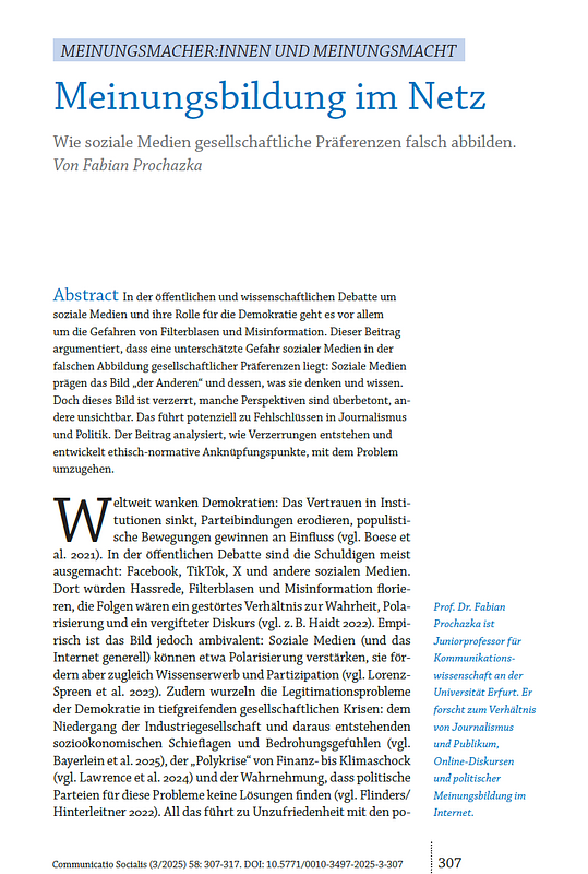 Prochazka, F. (2025). Meinungsbildung im Netz. Wie soziale Medien gesellschaftliche Präferenzen falsch abbilden. Communicatio Socialis, 58(3), 307–317. https://doi.org/doi.org/10.5771/0010-3497-2025-3-307